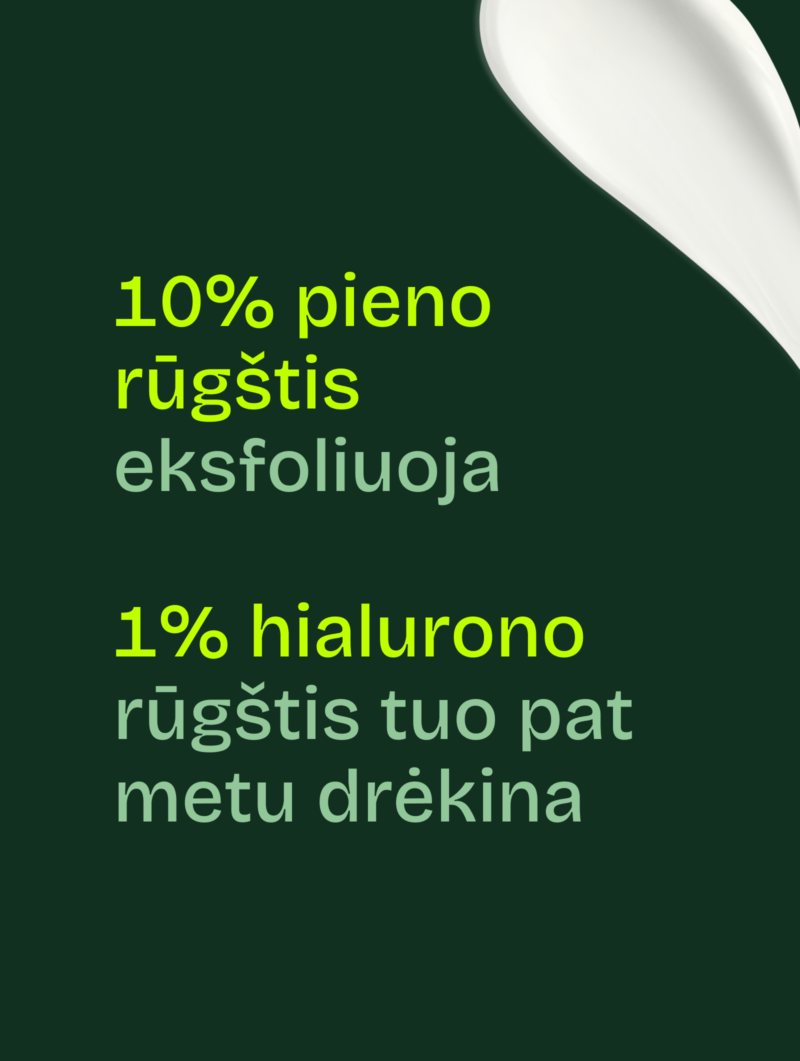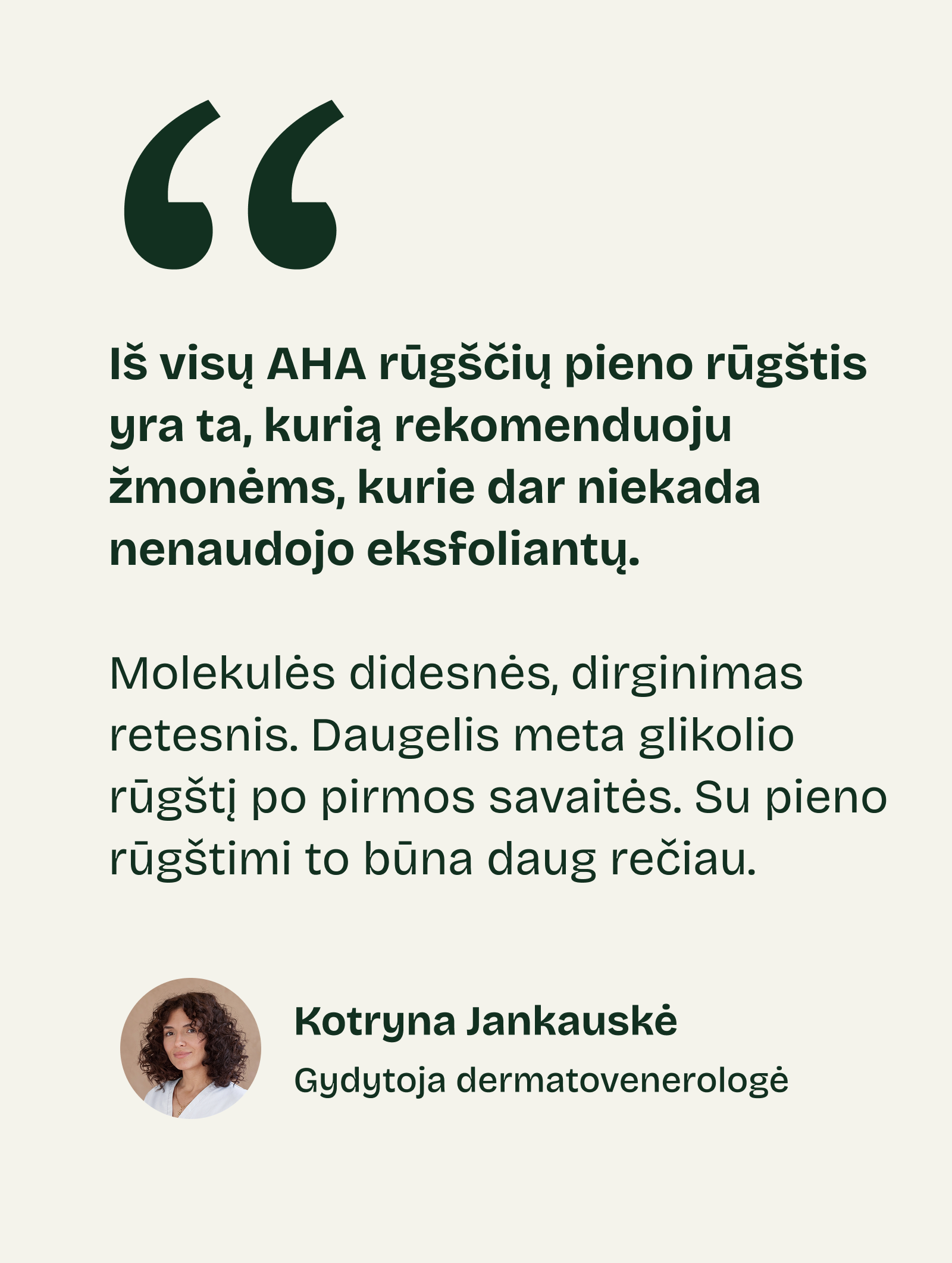 Pieno rūgštis yra švelniausia iš AHA rūgščių — didesnės molekulės skverbiasi lėčiau ir sukelia mažiau dirginimo nei, pavyzdžiui, glikolio rūgštis. Tai ją daro tinkamą net jautresnei odai, tačiau pirmą kartą rekomenduojame pradėti nuo vieno naudojimo per savaitę ir stebėti odos reakciją.
