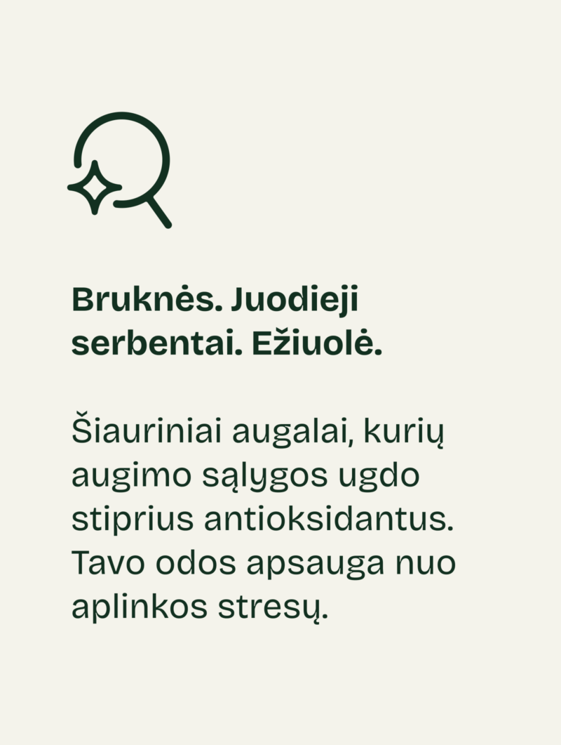 Bruknių ekstraktas (Vaccinium Vitis-Idaea) — stiprus šiaurietiškos kilmės antioksidantas, saugo odą nuo aplinkos poveikio ir lėtina oksidacinius procesus.