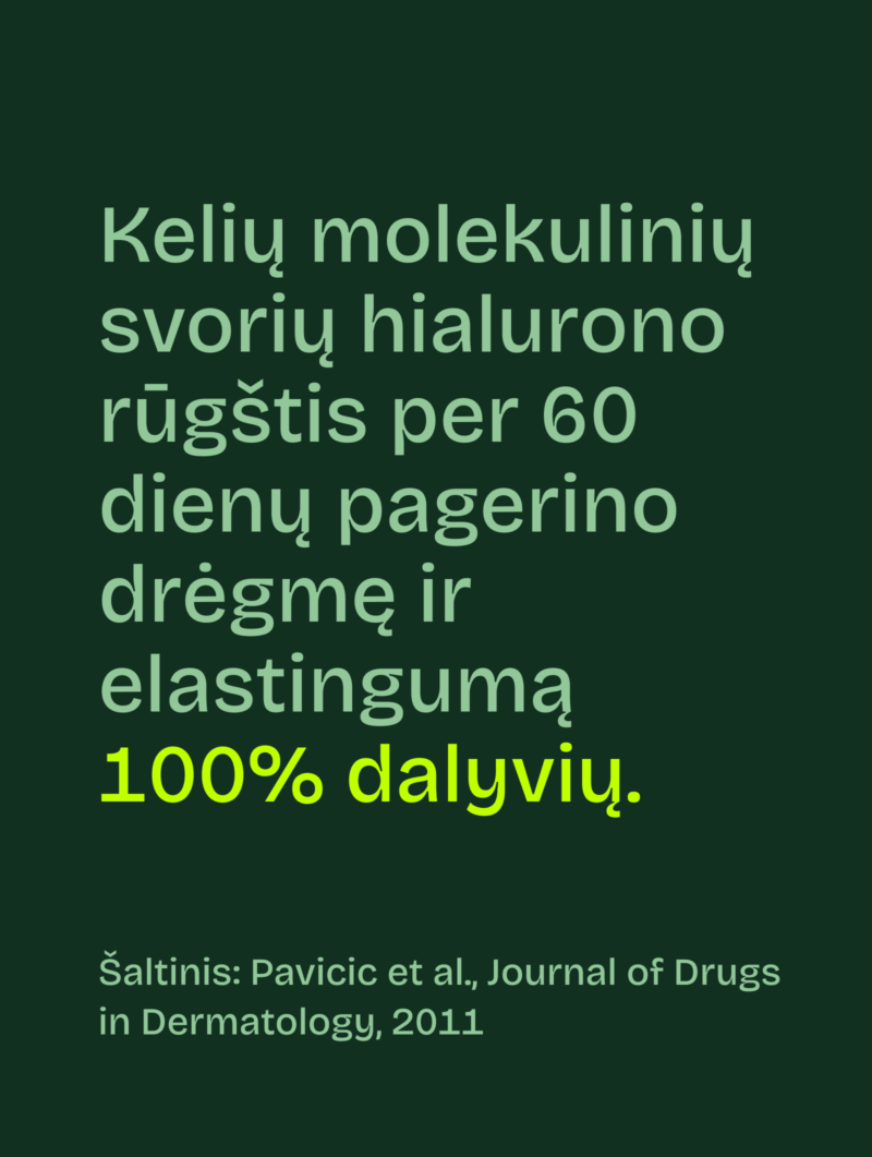 Hialurono rūgštis (Hydrolyzed Hyaluronic Acid + Sodium Hyaluronate) — dviejų molekulinių svorių formulė drėkina tiek paviršiuje, tiek giliau, mažina smulkių raukšlelių išvaizdą ir palaiko odos elastingumą.