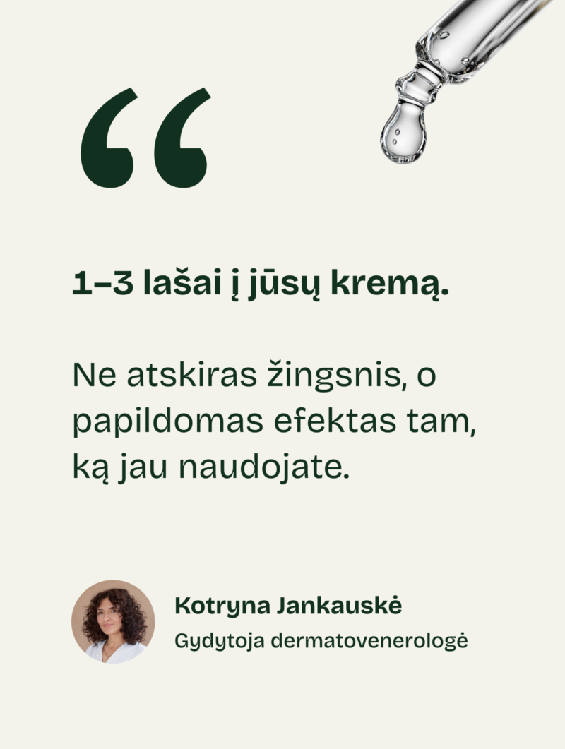 Įmaišykite 1–3 lašus į įprastą veido ar paakių kremą prieš tepant. Koncentratas nėra skirtas naudoti atskirai — jis sustiprina jau naudojamo kremo poveikį, nepaisant jo sudėties ar tekstūros.