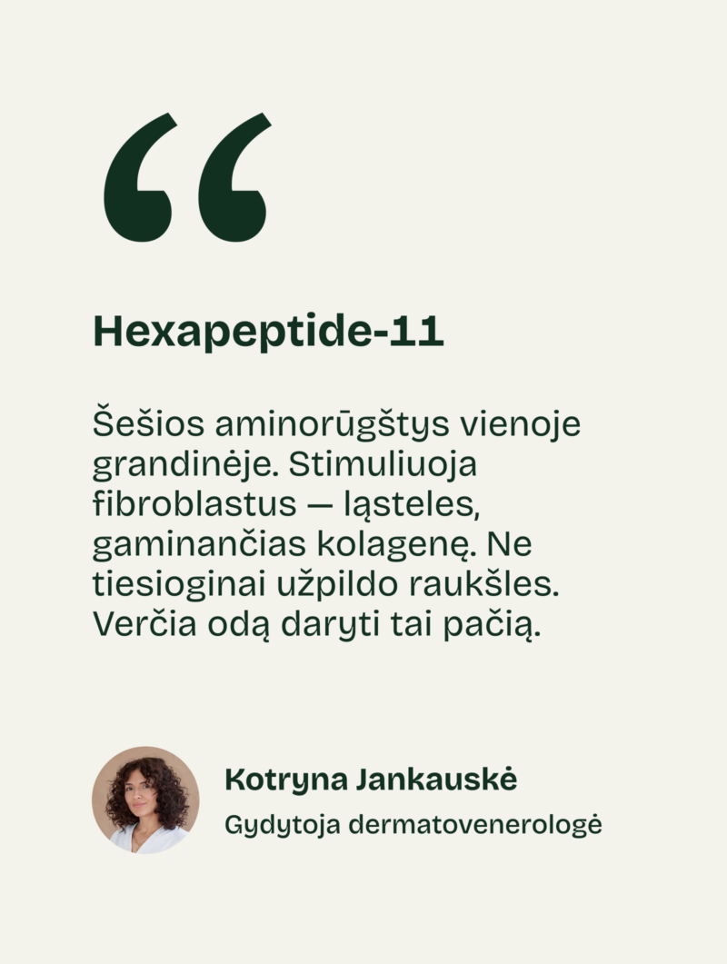Hexapeptide-11 — sintetinis peptidas, sudarytas iš šešių aminorūgščių grandinės. Jis stimuliuoja fibroblastus — ląsteles, atsakingas už kolageno ir elastino gamybą — todėl oda ilgainiui tampa standesnė ir raukšlės mažiau ryškios. Skirtingai nei tiesioginis kolagenas, peptidai yra pakankamai maži, kad prasiskverbtų į odą ir veiktų ten, kur reikia.