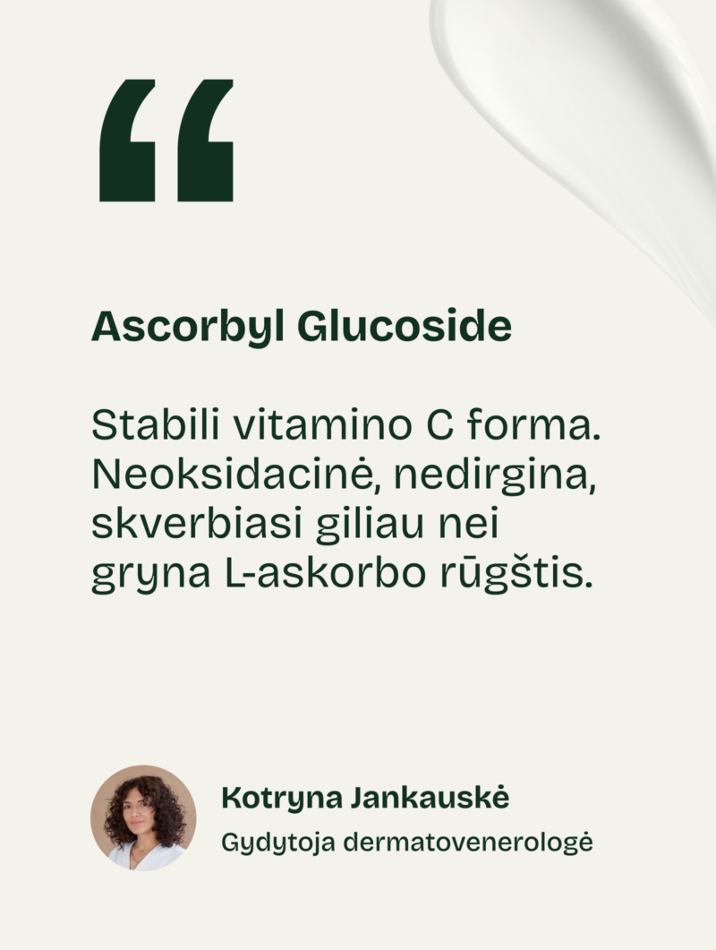 2% Vitaminas C (Ascorbyl Glucoside) — stabili vitamino C forma, lėtai veikianti odos gylį. Šviesia, lygina toną, neutralizuoja laisvuosius radikalus.